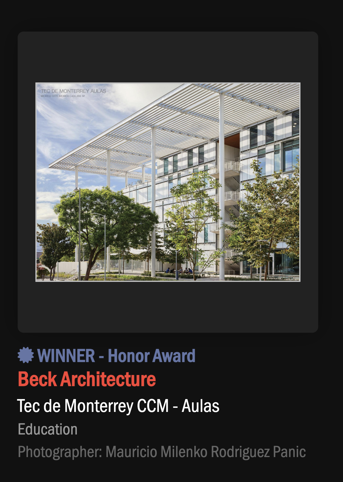 Beck Group ganó el concurso de AIA Dallas Design Awards 2023 por el proyecto de las Aulas 1 y 2 del Tecnológico de Monterrey Campus Ciudad de México.